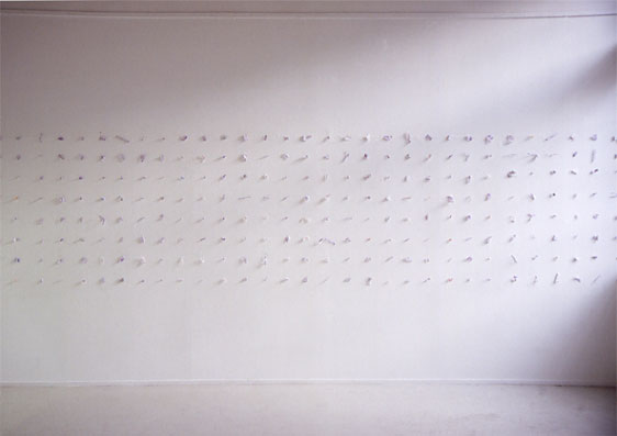 Pinned Thoughts (Bird in Hand) 2003 bus tickets, pins, mounts Dimensions variable A wall installation of subconscious oragami consisting of 240 used bus tickets,