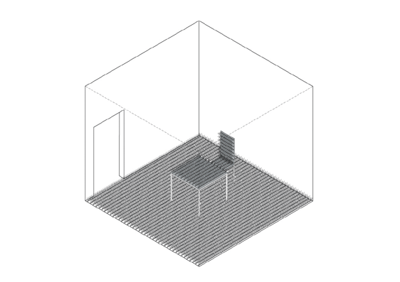 Spiked conceived 2001 Pigeon detterent spikes, table, chair Dimensions variable The entire floor of a small room and the table and chair within it are covered with pigeon deterrent spikes. These spikes are commonly used on buildings to prevent pigeons landing.