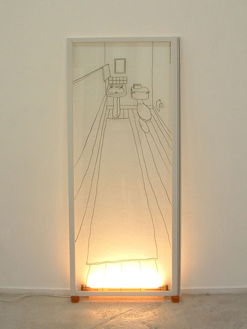 Early Morning View (morning drawing) 2004black marker, shower screen, soap, light800x1900